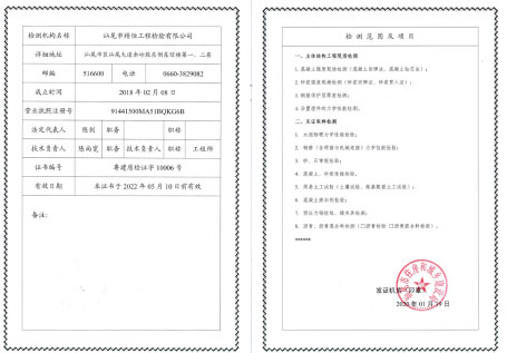 本公司2019年1月首次通过广东省市场监管局资质认定(计量认证),证书编号为:201919024159.通过计量认证项目有建设(地质勘察、公路交通、水利)工程质量检测1个领域8个大类 68产品类别769个参数。主要检测业务包括:主体结构工程现场检测;钢结构工程检测;地基基础工程检测;建筑幕墙工程检测;建筑节能检测;雷电防护装置检测;建筑工程施工现场安全防护用品检测;新材料检测服务(第三方检测、检测、测试、分析、认可、计量活动);产品质量、性能、安全性等检测服务;涉及结构安全项目的抽样检测;对进入施工现场的建筑材料、构配件的见证取样检测;人防工程检测;房屋安全检测(鉴定);岩土工程;混凝土工程;金属结构;噪声与振动防控监测服务;水污染监测服务;生活废水监测服务;环境保护监测;建筑工程测量;市政工程测量等建设工程质量的检验检测工作。
